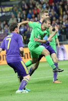 А в середине тайма «Рубин» смог извлечь дивиденды из своего небольшого территориального перевеса и открыл счет! Мавинга снова набрал крейсерскую скорость на левом фланге и от самой лицевой прострелил в центр чужой штрафной площади, где никем не опекаемый Карадениз сначала спокойно обработал мяч, а вторым касанием просто-напросто расстрелял владения Ясмина Хандановича – 0:1. Поведя в счете, казанцы не стали успокаиваться, а продолжили совершать подходы к воротам противника. Дважды в течение одной минуты владениям «Марибора» своими ударами с дальней дистанции угрожал Рязанцев. И если в первом случае удар у Александра вышел неточным, то со вторым выстрелом полузащитника «Рубина» Ханданович справился не без труда, отбив снаряд на угловой. Стандартное положение подопечные Курбана Бердыева разыграли образцово-показательно! Натхо с левого «корнера» навесил на ближнюю штангу, где Рондон грамотно пропустил мяч, и тот перелетел на дальнюю штангу, откуда никем не прикрытый Маркано поразил уже пустые ворота – 0:2. Очень здорово провел этот пятиминутный отрезок казанский клуб, сделав весомую заявку на победу! Два пропущенных гола повергли в шок словенских футболистов. Они выглядели опустошенными, позволяя соперникам играть в свое удовольствие. Никакой остроты у ворот Рыжикова «фиалки» создать не могли. Лишь на 34-й минуте подопечные Анте Чачича впервые за долгое время смогли нанести акцентированный удар в сторону владений соперника. Это Таварес откликнулся на подачу с правого фланга и пробил головой, но в створ не попал. Забив два гола, игроки «Рубина» расслабились, отдали сопернику мяч и инициативу, чем словенцы и воспользовались. Правый защитник «Марибора» Милец подключился к атаке своей команды, ушел от опеки Карадениза и хлестко пробил в ближнюю от себя «девятку», застав врасплох Рыжикова – 1:2. Из ничего пришел этот гол. Пропущенный мяч должен был пойти на пользу казанцам, которые стали действовать чересчур академично, посчитав, что дело сделано. На волне успеха хозяева провели еще несколько стремительных атак, но они получились не столь опасными. Чересчур увлеклись своими атаками игроки словенского клуба, за что их едва на 39-й минуте не наказал Рондон. К счастью для хозяев, венесуэльский форвард не смог переиграть Ясмина Хандановича в ближнем бою. В концовке тайма шла игра на встречных курсах, однако голевых моментов мы до перерыва больше не увидели. Кроме того, Анте Чачич на 44-й минуте провел первую замену в составе своей команды. Получившего травму Аргуса сменил Деян Трайковски. Уже в компенсированное время Таварес плотно пробил по воротам Рыжикова с дальней дистанции, однако в створ бразилец не попал. На этом первый тайм и подошел к своему концу.