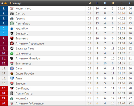 Китай. 26 тур. Сенсации и тренерские успехи. «Чунцин Лифань» дал бой лидеру. Уже на исходе трети тайма хозяева открыли счёт. Чемпион отыгрался по истечении получаса, а на экваторе второй половины вышел вперёд. Казалось, что своего подопечные Сколари уже не упустят, однако Фернандиньо за десять минут до свистка сравнял счёт. Чемпион оступился во втором туре кряду, вернув интригу в золотую гонку, поскольку «Шанхай СИПГ» свой матч выиграл. «Бэйцзин Гоань» тоже уперся дома, но Оскар с паса Халка забил через полчаса после начала. Поведя в счёте, команда Вилла-Боаша заиграла от обороны. Хозяева смотрелись лучше и давили на протяжении всего оставшегося времени, но так и не сумели отыграться, наиграв в компенсированное время на удаление. Трудовая победа «Шанхай СИПГ» позволяет сократить отставание до четырех очков, в запасе у команды Виллаш-Боаша ещё четыре тура. «Цзянсу Сунин» шёл к очередной ничьей, закупорив подходы к воротам, однако в концовке хозяева слишком уж прижались к воротам. За минуту до конца Ян вынес мяч из пустых ворот, но уже в следующей атаке ляп голкипера Чао позволил Рубену Кастро вырвать победу для «Гуйчжоу Чжичэн» «Шанхай Шеньхуа» наконец встрепенулся, обыграв крепкий «Гуанчжоу Фули». Гуарин открыл счет на исходе получаса игрового времени, а в дебюте второго Морено реализовал пенальти. Гости быстро вернулись в игру, сквитав один мяч, и в дальнейшем оказывали мощное давление на ворота Шуаи, но «Шанхай Шеньхуа» выстоял, а в компенсированное время Морено оформил дубль. Смена тренера приносит плоды, хотя более впечатляющими они оказались в мёртвом «Тяньцзинь Тэда». Тяньцзиньское дерби закончилось с неожиданным результатом. Борющийся за «бронзу» «Тяньцзинь Цюаньцзянь» был уничтожен не побеждавшими на протяжении 12 туров земляками. Ули Штилике всё же нашёл подход к своим ребятам. Результат во многом определил трехминутный отрезок в середине первого тайма, за который Ачимпонг оформил дубль. За пятнадцать минут до конца больше владевшие мячом, но инертные гости получили третий. Пато подсластил пилюлю незадолго до свистка, но автогол Вонга Джие вернул крупный счёт на табло. Другие претенденты на третью строчку поддержали почин команды Каннаваро. «Хэбэй Чайна Форчун» не смог вскрыть оборону «Чанчунь Ятай» - счет в матче так и не был открыт. «Шаньндун Лунэн и вовсе проиграл. Не хватающий звезд с неба «Хенань Цзанье» оформил комфортный задел в два мяча уже к середине первого тайма. Гости смогли лишь в компенсированное время подсластить пилюлю – мяч рикошетом от голкипера Яна скакнул в ворота после удара Пелле. «Шаньдун Лунэн» не может победить уже на протяжении пяти туров. В дуэли двух аутсайдеров победу праздновал более живой «Яньбянь». Хозяева смотрелись чуть острее, но не кардинально, а исход встречи решил угловой, удачно поданный ими в середине второго тайма. Отличился незадолго до этого вышедший на замену Рен. Победы изменили расстановку сил – теперь на дно упал «Ляонин Хувин». Результаты 26-го тура ![]() Турнирная таблица ![]() Бразилия. 25 тур. «Сантос» выходит на второе место «Коринтианс» вновь потерял очки. На сей раз народная команда оступилась в гостях у «Сан-Паулу». Вернувшийся на родину Петрос вывел хозяев вперёд в середине первого тайма. И до, и после гола они ни в чём не уступали лидеру. «Коринтинас» сумел уйти от 