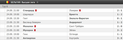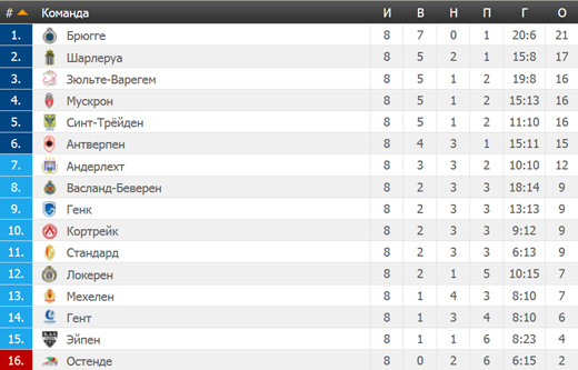 В центральном матче тура сошлись лидеры – не знавший поражений «Шарлеруа» принимал отклеившийся на одно очко «Брюгге». Игра получилась равной и долго оставалась безголевой, но в концовке команды всё же побаловали зрителей. В середине второго тайма Уэсли принял мяч в штрафной, качнул опекуна и ковырнул мяч в угол. Закрытый защитниками голкипер не реагировал. Через десять минут «Шарлеруа» отыгрался – свежий Тайнмонт вырезал классный кросс по диагонали на дальний угол вратарской, откуда набежавший Резаеи вколотил мяч в сетку. И всё же «Брюгге» вырвал победу. За пару минут до финального свистка Лимбомбе взял игру на себя и с угла штрафной бильярдным ударом уложил мяч под дальнюю стойку. «Брюгге» оторвался на четыре очка от соперника.
