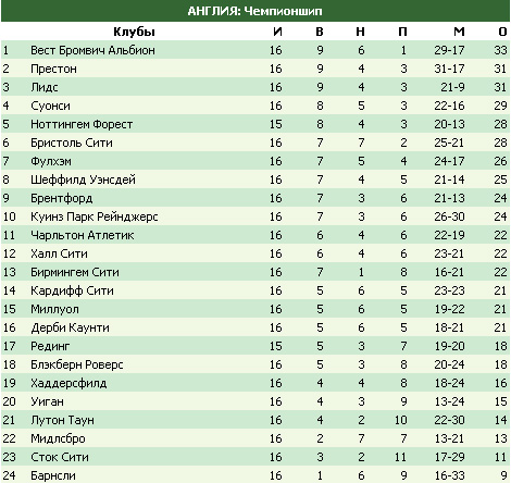 «Футбол на куличках» не упускает из виду интересные футбольные чемпионаты, которые могли пройти мимо самого изощрённого болельщика. Ведь внимание к ведущим приковано колоссальное, остальные вынуждены находиться в тени. Побороться с обилием звёзд АПЛ, где «Ливерпуль» в зубодробительном матче обыгрывает «Манчестер Сити» Пепа Гвардиолы, невозможно. Но рубрика «За пределами ФНК» познакомит вас с насущными делами пяти не менее интересных чемпионатов. Английский чемпионшип удивил, победили практически все лидеры, а первую строчку сохранил «Вест Бромвич» Славена Билича. Сразу позади расположились те, кто до начала сезона назывался главными претендентами на повышение в классе – «Лидс» и «Суонси», к которым добавился неожиданный «Престон». В чемпионате Бразилии вернулся к победам «Фламенго» во главе с Жорже Жезушем, «Палмейрас» и «Сантос» догнать лидера не могут, хотя очень стараются. «Брюгге» рулит в Бельгии, не давая особого шанса претендентам, среди которых выделяются «Гент» и «Стандард». В чемпионате Китая очередной перерыв, футболисты вернуться на поле в самом конце ноября. А пока гегемоны «поднебесной» создали себе невероятный отрыв. «Гуанчжоу Эвергранд» опережает «Шанхай СИПГ» Халка и Оскара на один балл, а те в свою очередь на то же расстояние обгоняют «Бэйцзин Гоань». Впереди невероятная борьба за золото, до финиша всего 3 тура осталось. Зато в чемпионате Чехии обходится без неожиданностей. Пражская «Славия» сминает всех и вся, в том числе главного преследователя – «Викторию» Пльзень. Отрыв уже измеряется 11-ю очками. Ещё немного позади «Млада» Болеслав Николая Комличенко. На этом затравка закончена, давайте подробнее взглянем на каждый из перечисленных турниров.Англия. Чемпионшип. 16 тур. «Суонси» отваливается от лидирующей группы Лидеры сезона в прошлом туре победили всем скопом, в этом туре оступился только один коллектив. «Вест Бромвич» с трудом одолел «Халл Сити», но лидерство сохранил. «Дрозды» не пропускают два тура кряду. В понедельник получил «Сток Сити»: по голу в каждом тайме забили главные голеадоры «Вест Бромвича» - Мэтт Филлипс и Хал Робсон-Кану. То было в начале недели, а в конце команда Славена Билича совершила результативный выезд в Халл. В равном матче были биты «тигры». Джэк Ливермор отличился в первом тайме и этого мяча хватило для победы. Выиграли и в этом туре не только «дрозды», почти все преследователи оказались сильнее соперников. А плотно преследуют коллектив Славена Билича два клуба. Особняком стоит «Лидс» - подопечные Марсело Бьелсы единственные, кто пропустил за 16 туров однозначное количество голов (9). В позапрошлый уик-энд всухую был повержен «КПР», а вот на прошлой неделе «белые» пропустили. «Розы» из Блэкберна отыграли один мяч усилиями Уильямса, но случилось это при счёте 2:0, когда Бэмфорд и Харрисон уже добыли уверенное преимущество «белым». В итоге матч закончился со счётом первого тайма, а минимальная победа оставила «Лидс» на третьем месте. Равное количество очков с коллективом Марсело Бьелсы имеет скромный «Престон». Но по дополнительным показателям «неуязвимые» выше. В субботу ими был повержен «Хаддерсфилд», который только недавно спустился из АПЛ. Всего один удар в створ нанесли гости, он и завершился голом Бакуны. Но это было сделано совсем поздно, помогло только избежать р