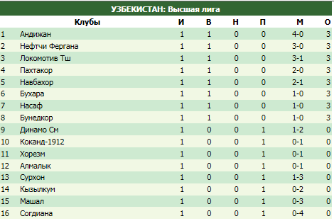 В Узбекистане начался новый футбольный сезон. "Нефтчи", завоевавший в прошлом году долгожданное чемпионство, в матче против "Машала" не реализовал множество моментов, но всё равно добился разгромной победы. Настрой команды — защитить титул, а о недооценки соперника не могло быть и речи. Вице-чемпион Узбекистана "Пахтакор" владел преимуществом во встрече с "Кызылкумом", при этом дожал соперника лишь в концовке встречи. Наставник "львов" посетовал после матча, что соперник оборонялся очень глубоко. Три очка набрал и "Насаф", забивший в ворота "Хорезма" на последней минуте матча. "Алмалык" имел игровое преимущество во встрече против "Бунёдкора", но гости забили победный гол в середине второго тайма. "Андижан" разгромил "Согдиану", отправив в ворота соперника четыре безответных мяча. "Бухра" с минимальным счётом обыграла "Коканд". Быстрый гол не помог динамовцам из Самарканда набрать очки во встрече с "Навбахором", одержавшим волевую победу. Ташкентский "Локомотив", вернувшийся в Суперлигу после годичного перерыва, оказался сильнее "Сурхана" — на три мяча "железнодорожников" тармезцы ответили лишь одним.