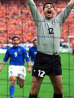 На 61 мин. Патрик Клюйверт не реализовал пенальти (штанга).Сборная Голландии уступает в серии послематчевых пенальти итальянцам и выбывает из турнира. Матч получился один из самых драматичных в чемпионате. Уже на 33 минуте сборная Италии осталась вдесятером - за второе предупреждение был удален Дзамбротта. Голландцы атаковали на протяжении двух часов, но не сумели поразить ворота Франческо Тольдо. И дважды в основное время матча голландцы не сумели реализовать пенальти. Самые зрелищные команды чемпионата - Португалия и Голландия, покидают Евро-2000.