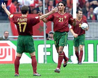 Сенсации не случилось, сборная Португалии, которая считается главным открытием ЕВРО-2000, победила турецкую сборную и вышла в полуфинал. Португальцы не изменили своей манеры играть в комбинационный, красивый и атакующий футбол. Вновь главными действующими лицами стали Фигу, Нуно Гомеш и Руй Кошта. Правда главной проблемой турок в этом матче стало то, что с 29 минуты они играли вдесятером и на последней минуте первого тайма Ариф не реализовал пенальти. У турок перед матчем были опасения, что из-за микротравмы не выйдет лучший форвард Турции Хакан Шукур, но герой матча с Бельгией все-таки появился. Португальцы поставили в основной состав автора хет-трика с Германией - Сержио Консесайо. Начало матча проходило в неторопливой, позиционной борьбе. Обе команды уделяли большое внимание обороне, порой в ущерб атаке. К середине первого тайма стало вырисовываться преимущество португальцев. На 19 минуте Да Кошта был обязан открыть счет после розыгрыша углового в исполнении Фигу. Но молодой полузащитник в упор пробил во вратаря, над которым после этого сейва долго колдовали врачи. Через три минуты Фигу отличным дальним ударом мог забить и сам, но мяч пролетел впритирку со штангой. На 26 минуте впервые огрызнулись турки, опасно бил головой Хакан Шукур. Серьезные неприятности для турок начались на 29 минуте. После розыгрыша углового у ворот португальцев на газоне оказались Фернандо Коуту и Алпай. Турецкий защитник вставая двинул рукой в грудь Фернандо Коуту и был немедленно удален с поля. Несомненно этому решению арбитра помог блестящий актерский талант Коуту, который вместо груди держался за щеку. Оставшись вдесятером турки не стушевались и до поры до времени сдерживали атаки португальцев, которые в эти минуты умудрились заработать четыре желтых карточки. За минуту до конца тайма португальцы все-таки открыли счет. Луиш Фигу справа навесил точно на голову Нуно Гомеша и молодой форвард головой забил очень красивый мяч. Уже в добавленное арбитром время судья наказал Фернандо Коуту пенальти, за то, что тот зацепил Арифа в штрафной площади. Пострадавший сам вызвался бить пенальти и попал прямо во вратаря, а Хакан Шукур не успел на добивание. Мастерство Фигу позволило Португалии во втором тайме увеличит счет. На 56 минуте он мастерски сделал передачу на Нуно Гомеша, которому оставалось лишь не промахнуться по пустым воротам. После второго гола португальцы заиграли раскованно и могли не раз отличиться, но до конца матча счет не изменился. В полуфинале сборная Португалии встретится с победителем пары Испания - Франция.