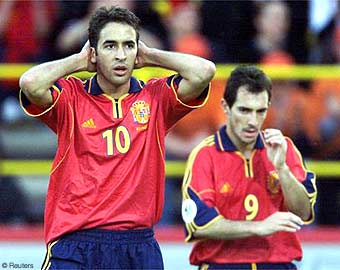 Сборная Франции выходит в полуфинал чемпионата, где 28 июня встретится со сборной Португалии. Но французы должны благодарить судьбу, что им удалось сохранить победный счет. За минуту до конца встречи один из лучших испанских форвардов Рауль не реализовал одиннадцатиметровый удар. Встреча началось в очень быстром темпе, испанские футболисты старались быстро доставить мяч на половину французов, но атаки быстро разбивались об мощных защитников французов. Французы больше контролировали мяч, выигрывали почти всю борьбу в воздухе, а в центре поля блестяще действовал Зидан. Первый явно голевой момент создали испанцы. Рауль, получив мяч от Альфонсо, увидел вышедшего на 8 метров из ворот Бартеза и моментально пробил. Вратарь в акробатическом прыжке все-таки ухитрился перевести мяч на угловой. На 29 минуте Дюгарри нашел в штрафной Зидана, но удар у последнего не получился. На 33 минуте Арансабаль в 20 метрах от ворот сбивает Джоркаеффа. Штрафной взялся бить Зидан и прекрасным обводящим ударом послал мяч в левую девятку. Ответный гол испанцев стал явной заслугой Мунитиса. Атакующий полузащитник в первом тайме затерзал своего визави Тюрама, и на 39 минуте французский защитник зацепил Мунитиса в штрафной - справедливый пенальти. Мендьета, обманув Бартеза, хладнокровно забил гол. За минуты до конца первого тайма проход Виера завершился пасом на Джоркаеффа. Полузащитник вошел в штрафную и неожиданно сильно пробил в ближний от вратаря угол. Гол и на перерыв французы ушли ведя в счете. Весь второй тайм испанцы провели в атаках, но французы грамотно оборонялись и отдав инициативу резко контратаковали. Голевых моментов не возникало и ход игры полностью устраивал французов. За несколько минут до конца встречи испанцы устроили настоящий штурм у ворот Бартеза и на 89 минуте добились права на пенальти. Как и в матче с югославами (напомним, что на 92 минуте там также был назначен пенальти) в штрафной французов был сбит Абелардо, вина за это полностью лежит на Бартезе. Это, кстати, был уже второй пенальти назначенный арбитром Коллиной на последней минуте. Штатный пенальтист сборной Мендьета был к этому времени уже заменен и к мячу направился Рауль. Бил он, казалось, наверняка, но мяч в последний момент сошел с ноги и пролетел выше ворот. Очередная трагедия чемпионата, очередной захватывающий сюжет матча. К чести испанцев нереализованный пенальти их не сломил и уже в добавленное арбитром время они создали еще один стопроцентный голевой момент. Урсаис после навеса Альфонсо бил головой в упор, но мяч непостижимо пролетел выше ворот.