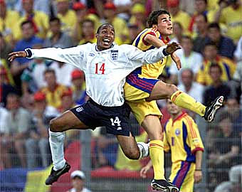 Сборная Румынии благодаря пенальти на предпоследней минуте матча выходит в четвертьфинал чемпионата Европы, где встретится с Италией. Англичанам в этой встрече достаточно было ничьи для выхода в следующий круг, но видимо судьба у родоначальников футбола вылетать из крупных турниров благодаря каким-нибудь фатальным ошибкам своих защитников. Вспомним Бэтти, Саутгейта, теперь в Англии новый антигерой - Фил Невилл. Начало матча было за румынами, которым победа была нужна как воздух. В составе румын из-за дисквалификации отсутствовал лидер команды Георги Хаджи, но без него у румын намного выросли скорости. Голкипер англичан Найнджел Мартин, который заменил основного вратаря сборной Дэвида Симэна за несколько минут до начала встречи по непонятным обстоятельствам, трудился в поте лица с первых минут. Гол назревал и состоялся, правда получился он каким-то совершенно глупым. Левый защитник румын Чиву после прохода со своего фланга пытался навесить мяч на дальнюю штангу, но мяч срезался и по неожиданной траектории угодил в правую штангу, а от нее в ворота. Изумленный Мартин лишь проводил его взглядом. На 34 минуте счет должен был стать 0:2, Илие с передачи Петреску оказался в одиночестве перед Мартином и головой пробил прямо во вратаря. Вскоре англичане сравняли счет, опытнейший Пол Инс был сбит в штрафной румын Кристианом Чиву. Ширер уверенно реализовал пенальти. Сравняв счет англичане прибавили обороты и на последней минуте первого тайма вышли вперед. Великолепный пас Скоулза вывел Майкла Оуэна один на один, нападающий переиграл вратаря и с острого угла забил второй гол. Едва начался второй тайм, как вновь грубейшую ошибку совершил Мартин. Кинувшись на перехват мяча вратарь лишь отбил его, но прямо на Мунтяну, который сильным ударом послал мяч в пустые ворота. К середине второго тайма румыны полностью перехватили инициативу. Английская сборная большую часть тайма думала лишь о том, как сохранить свои ворота, а в атакующих действиях было очень мало мысли и задора. Главный тренер Кевин Киган поочередно заменил лучших игроков матча - Оуэна, Скоулза и Уайза - делая упор главным образом на оборону. Когда стрелка секундомера пошла отсчитывать предпоследнюю минуту и случилось то, что должно было случиться. Молдован продирался по правому флангу, но защитник МЮ Фил Невилл решает сделать подкат в штрафной площади и попадает по опорной ноге румына. Пенальти! Вышедший на замену Ганя расчетлив.