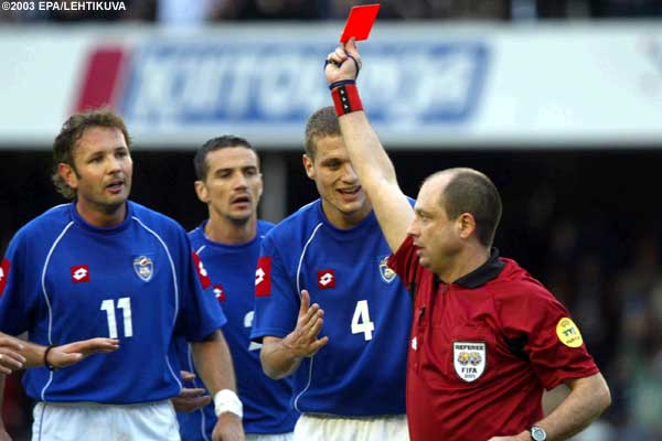 Европы 2004, разгромив на своем поле сборную Сербии и Черногории. На 19-й минуте счет открыл защитник "Ливерпуля" Сами Хююпиа. На 26-й минуте положении гостей стало вовсе плачевным, когда за грубый фол против Форсселла был удален Синиша Михайлович. На последней минуте первого тайма второй гол забил Колкка, а во втором тайме отличился Форсселл, забивший гол после блестящего сольного прохода.