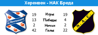 Статистика встреч: 22-10-9 (83:60) | Сезон 2013/2014 | 10.08.2013 НАК Бреда - Херенвен - 0:2 | | Сезон 2012/2013 | 02.03.2013 НАК Бреда - Херенвен - 1:2 | 29.09.2012 Херенвен - НАК Бреда - 2:0 | | Сезон 2011/2012 | 17.02.2012 Херенвен - НАК Бреда - 1:0 | 26.11.2011 НАК Бреда - Херенвен - 2:2 | | Сезон 2010/2011 | 13.02.2011 НАК Бреда - Херенвен - 0:2 | 21.08.2010 Херенвен - НАК Бреда - 3:1 | | Сезон 2009/2010 | 18.04.2010 Херенвен - НАК Бреда - 0:0 | 30.08.2009 НАК Бреда - Херенвен - 2:0 | |