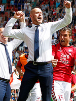 "Утрехт" под руководством Эрика тен Хага продолжил поступательное движение вверх. Прошлый сезон был омрачён двумя неудачами. Утрехтцы дошли до финала Кубка, где уступили "Фейеноорду", а также в финальных матчах плей-офф за право сыграть в Лиге Европы уступили "Хераклесу", в итоге оставшись без еврокубков на будущий сезон. Впрочем, как мы говорили в обзоре прошлого сезона - это вряд ли скрасило общее впечатление о игре добротного коллектива под руководством амбициозного тренера. Поступательное движение продолжилось и в новом сезоне. Хотя начало этого нового сезона удачным никак назвать не получится. В шести стартовых встречах утрехтцы не одержали ни одной победы, набрав всего три очка и расположившись на низкой 16-й позиции. Главной проблемой стала потеря лидера команды Барса Рамселара, который перебрался в ПСВ. Кроме того, в начале сезона тен Хаг не мог рассчитывать на нескольких важных исполнителей. Первая победа случилась в 7-м туре, когда была повержена "Спарта". Эрик тен Хаг начал находить оптимальное сочетание игроков. Пару Аллеру в атаке составил Ришайро Живкович, в которого наставник поверил и вновь раскрыл потухшую звёздочку. Ключевым игроком по ходу сезона также стал Насер Баразит. Кстати как раз они и принесли своей команде первую победу в этом сезоне. Далее было поражение от "Аякса" после которого утрехтцы выдали блестящую беспроигрышную серию, состоящую из десяти матчей кряду (6 побед и 4 ничьи). Прервалась же эта серия вновь на "Аяксе". Команда тен Хага проиграла также ПСВ и "Фейеноорду" во втором круге, а также "Хераклесу". В остальном неизменно набирала очки, преимущественно побеждая своих конкурентов. Всё это в совокупности позволило занять четвёртую строчку по итогам сезона. За последние 25 лет так высоко утрехтцам подниматься не удавалось. "Утрехт" не только поднялся на строчку выше по сравнению с предыдущим сезоном, но и улучшил свои показатели по пропущенным мячам, коих на 10 стало меньше. Было набрано 62 очка и это второй показатель в истории клуба. Лучшим является сезон 2012-13, тогда на один балл было набрано больше. Кстати, отрыв от ближайшего преследователя "Витесса" составил 11 очков. Но главное даже не это, а то, что в итоге удалось завоевать путёвку в Лигу Европы. Ещё задолго до конца сезона команда тен Хага обеспечила себе четвёртую позицию и была в ожидании плей-офф. Естественно было воспоминание о прошлом сезоне, когда в финальном раунде путёвка в итоге досталась "Хераклесу". Были близки к повторению подобного сценария утрехтцы и на сей раз. Если в полуфинальной битве с "Херенвеном" особых проблем команда тен Хага не испытала, то вот финальная игра с АЗ доставила серьёзных проблем. После первого матча преимущество алкмаарцев было в три мяча. Однако ответная домашняя встреча оказалась на стороне "Утрехта", который сумел отыграть этот гандикап, а итоговую победу одержал в серии послематчевых пенальти. Это была сумасшедшая развязка сезона. Эрик тен Хаг проделал за эти два года фантастическую работу и уже хоть сейчас готов пойти на повышение. Однако пока об этом разговоров нет, тренер уже делает трансферные покупки на будущий сезон, понимая, что скорее всего вновь придётся прощаться с некоторыми лидерами. Себастьен Аллер уже покинул "Утрехт", подписав контракт с "Айнтрахтом" из Франкфурта ещё по ходу сезона. Но утрехт