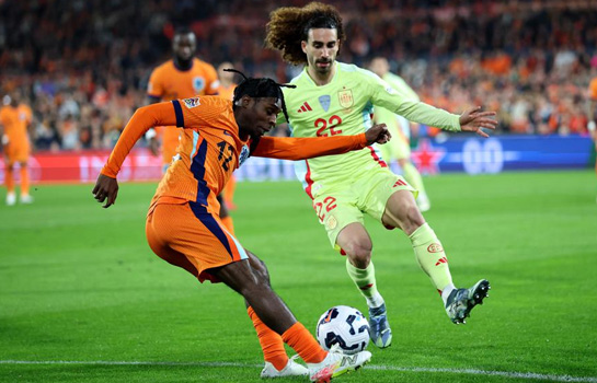 Очень напряженным и результативным получился первый четвертьфинальный матч Лиги наций между Испанией и Нидерландами. «Оранжевые» на своем поле быстро пропустили, однако смогли на исходе получаса встречи сравнять счет. А в самом начале второго тайма вышли вперед. Долгое время их минимальное преимущество сохранялось на табло. Однако в конце матча Испания усилила давление, и Нидерланды оказались в меньшинстве. Даже вдесятером хозяева неплохо держали оборону, пока в компенсированное время их не подловили на ошибке, которая закончилась голом Испании, добывшей стратегически важную победу на выезде. Впереди ответный матч, в котором испанцы уже будут фаворитами в вопросе выхода в полуфинал турнира. В этой же встрече у обеих команд были еще моменты, чтобы добыть победу, но не так много, чтобы говорить о критическом перевесе одной из сторон. Это типичное равное противостояние двух классных команд, судьбу которого решат мельчайшие детали ![]() Фото - УЕФА. Предыстория В четвертьфинале Лиги наций встречаются Испания и Нидерланды. Команды по-разному преодолели групповую стадию в элитном дивизионе. Испанцы не испытали никаких проблем и стали первыми в квартете с Данией, Сербией и Швейцарией с большим отрывом, набрав 16 очков. А вот Нидерландам пришлось повозиться в компании с Германией, Боснией и Герцеговиной и Венгрией. Лидером там стали немцы, а голландцы в итоге лишь на три очка опередили венгров, выйдя из группы со второго места. Свой последний матч с боснийцами Нидерланды завершили вничью (1:1), а перед этим разгромили Венгрию (4:0), что стало единственной победой в пяти последних матчах. У Испании же беспроигрышная серия длится с марта прошлого года, то есть 16 матчей. В пяти последних испанцы побеждали. В последнем поединке они были сильнее Швейцарии (3:2), а перед этим – Дании (2:1). Между собой нынешние соперники в предыдущий раз встречались в товарищеском матче в 2020 году, тогда случилась ничья (1:1). А в двух матчах перед этим побеждали Нидерланды. А самой известной встречей стал финал чемпионата мира 2010 года, когда в дополнительное время Андрес Иньеста принес Испании победу над «оранжевыми» (1:0). Что касается потерь, то у хозяев отсутствуют Аке, Думфрис, Схаутен, Гравенберх, а у гостей – Иньиго Мартинес, Марк Касадо и Карвахаль. Ход матча Гости начали матч более активно, сразу отправились в атаку и смогли создать напряжение у чужих ворот. Уже на второй минуте Педри на краю штрафной вывели на ударную позицию, но с его ударом в ближний угол Вербрюгген справился. Отвечал в похожем стиле Гакпо. Он тоже слева получил мяч, правда, метил в дальний угол. И его подвела точность. Вроде бы стали активизироваться «оранжевые», но испанцы умело вышли из-под прессинга и сумели забить быстрый гол. Справа на фланге Ямаль накрыл Хато, выцарапал мяч и отдал его на Педри ближе к воротам, а тот адресовал левее на Нико Уильямса, который в касание пробил с близкой дистанции в цель. 0:1. Голландцы попытались как-то прийти в себя и перестроиться. Но получалось пока только закидывать мяч вперед в расчете на рывки. Цепляться за мяч не удавалось, и испанцы неплохо отвечали, в целом контролируя ситуацию на поле. Все сводилось к единоборствам на отдельных участках поля после разнообразных забросов или фланговых рывков. Более разнообразно все равно атаковали испанцы, которым уда