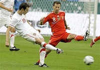 опередив Видича, но мяч отскочил в руку Павлу, что зафиксировал судья.