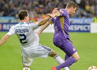 Стартовый состав «Фиорентины» не включал в себя ни одной итальянской фамилии. Ну что ж, Винченцо Монтелла любит варьировать сочетания, а соотечественников в его команде и без того довольно мало. В дебюте встречи флорентийский интернационал больше оборонялся, но вскоре забрал мяч под свой контроль. А на 12-й минуте рефери мог назначать в ворота хозяев 11-метровый. Салах по центру протащил мяч со своей половины поля до чужой штрафной, отпасовал влево Хоакину, тот пробивал слету, но Евгений Хачериди в падении заблокировал удар. Испанец тут же стар просить пенальти, да и повтор показал, что снаряд попал защитнику в район локтя. Конечно, Евгений пытался прижимать в руку, но это не помогло избежать контакта с мячом. В общем, эпизод, как говорится, на усмотрение арбитра. Указывать на точку здесь можно было, но, как видно, можно было и не указывать, как Шимон Марчиняк и поступил. Задавала темп «Фиорентина», темп очень и очень высокий. «Динамо» старалось не отставать от соперника и отвечать ему своими атаками, однако справляться со сверхбыстрым Салахом киевлянам было все тяжелее и тяжелее. К тому же, явно нервничал Хачериди, который еще до спорного эпизода с попаданиям мяча в руку пару раз чуть не напортачил. А уже в середине тайма украинцы остались без левого защитника Антунеша, который буквально на ровном месте подвернул ногу. Да, головной боли у Сергея Реброва в миг прибавилось. Вскоре она могла приблизиться к уровню нестерпимой: великолепную атаку, начатую Борхой Валеро, ударом с нескольких метров завершал все тот же Салах - Шовковский спас «Динамо» и избавил тренера от потребности в успокоительных. А через несколько минут и Александр вряд ли помог бы украинцам: Матиас Фернандес, с линии штрафной выстреливал в дальний нижний угол. Повезло хозяевам: мяч просвистел в сантиметрах от штанги. Стоило флорентийцам приблизиться к воротам «бело-голубых», там становилось жарко. Поэтому у «Динамо» был только один выход – отодвигать игру подальше от своих владений. Получалось это далеко не всегда, но эпизодические успехи имели место. А на 37-й минуте переполненные трибуны Олимпийского стадиона взревели от восторга. Джермейн Ленс, получил мяч у левого угла штрафной, сместился к центру и пульнул по воротам. Мяч угодил в ногу кому-то из защитников и, сменив направление, полетел точно в правую «девятку». Нето оставалось лишь проводить сферу взглядом. В аналогичной ситуации через несколько минут едва не оказался Шовковский: Фернандес исполнял штрафной метров с 20. Здесь тоже последовал рикошет, но транзитом через голову Теодорчика снаряд полетел над перекладиной.