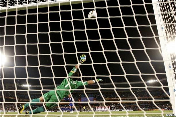 Серия пенальти: Комано бьет в перекладину. |